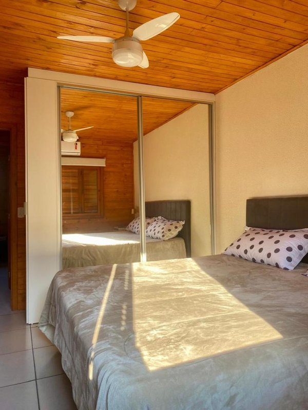 Casa com 03 dormitórios, sala de estar, cozinha, banheiro social, mobiliada. Amplo terreno cercado e gramado.